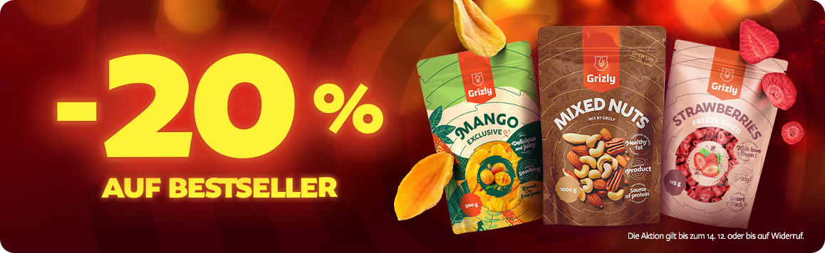 Brum chrum, die leckersten Geschenke für die ganze Familie, exklusive Leckereien für jeden Besuch und hochwertige Zutaten für duftendes Weihnachtsgebäck besorge ich – ich, Grizly. Nutzt jetzt zusätzlich 20% Rabatt auf fast 500 Köstlichkeiten. Darunter sind auch weihnachtliche Limited Editions, die schnell vergriffen sind. 🧡