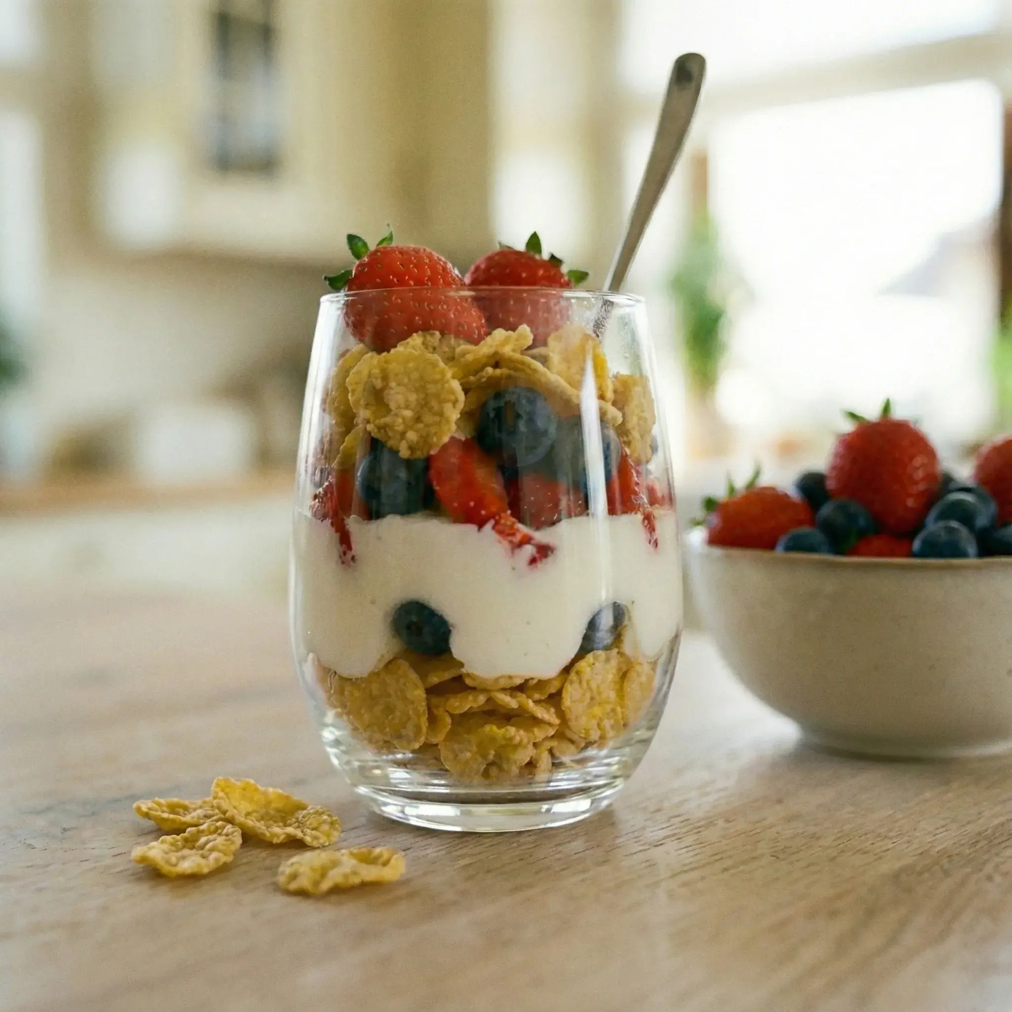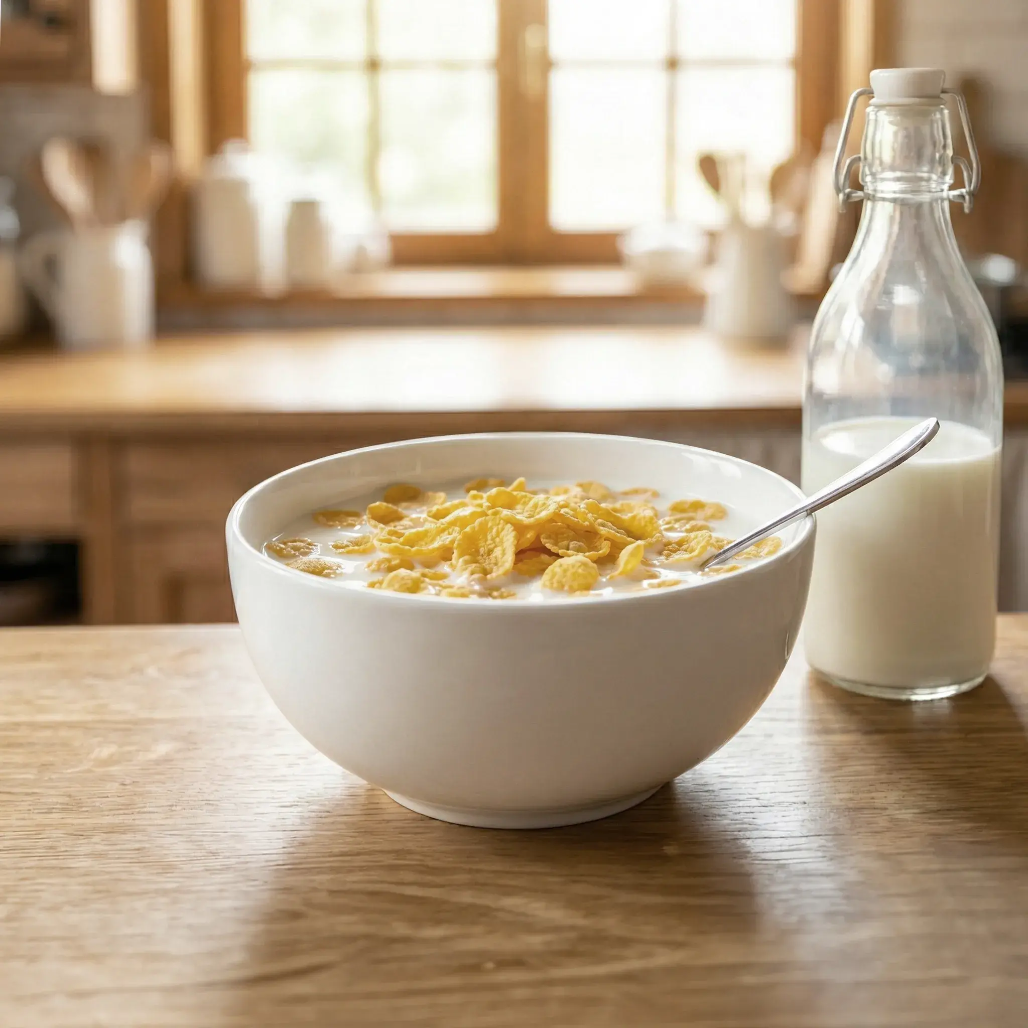 Ein nahrhaftes Frühstück voller Vitamine, das im Handumdrehen auf dem Tisch steht. Maisflocken, angereichert mit 9 Vitaminen und Eisen.