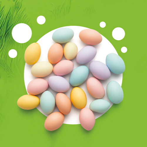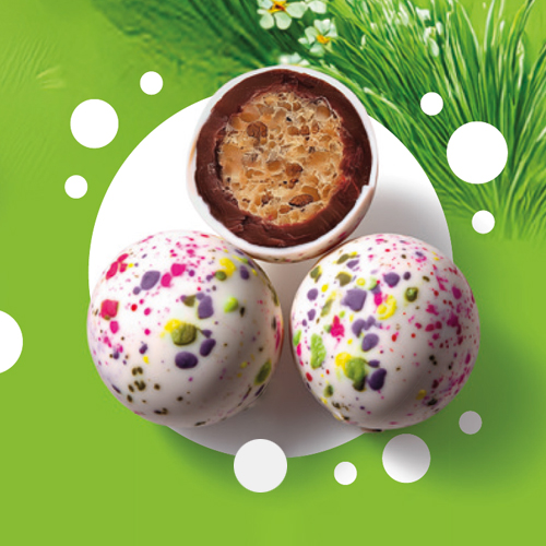 OSTER-KNUSPERDRAGEES. Knusprige Cerealienkugeln in Milchschokolade und Zuckerüberzug. Zutaten: Milchschokolade 52 % (Zucker, Vollmilchpulver, Kakaobutter, Kakaomasse, Emulgatoren: Sojalecithine; natürliches Vanillearoma, Kakaotrockenmasse: mind. 32 %), Zucker 35 %, knuspriger Cerealienkern 11 % (Weizenmehl, Vollkornweizenmehl, Zucker, Weizengluten, Weizenmalzmehl, Salz, Backtriebmittel: Natriumhydrogencarbonat), Reißstärke, Stabilisatoren: Gummi arabicum, Saccharoseester von Fettsäuren; Farbstoffe: Carotine, Kurkumin, Spirulina-Extrakt, Karmin; Maltodextrin; Überzugsmittel: Carnaubawachs. Kann Spuren von Erdnüssen und Schalenfrüchten enthalten. Nährwerte pro 100 g: Energie 1982 kJ/ 472 kcal; Fett 17,2 g, davon gesättigte Fettsäuren 10,5 g; Kohlenhydrate 74 g, davon Zucker 65 g; Ballaststoffe 2,2 g; Eiweiß 4,4 g; Salz 0,25 g.