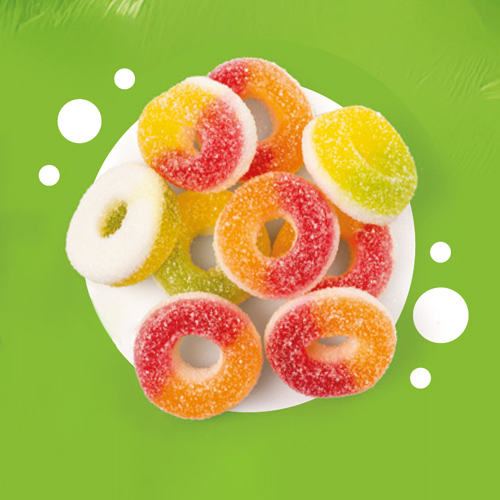 SAURE MINI-RINGE. Geleebonbons mit Fruchtgeschmack. Zutaten: Glukosesirup, Zucker, Traubensaft aus Konzentrat 5 %, Gelatine, Säureregulator: Zitronensäure; Säuren: Milchsäure, Fumarsäure; Verdickungsmittel: Pektine; Farbstoffe: Kurkumin, Kupferkomplexe der Chlorophylle und Chlorophylline, Paprikaextrakt; Konzentrat aus schwarzem Karottensaft, Aromen. Kann Spuren von Erdnüssen und Schalenfrüchten enthalten. Nährwerte pro 100 g: Energie 1461 kJ/ 344 kcal; Fett 0,1 g, davon gesättigte Fettsäuren 0 g; Kohlenhydrate 80 g, davon Zucker 54 g; Ballaststoffe 0,2 g; Eiweiß 3,8 g; Salz 0,03 g.