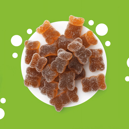 MANGO TEDDIES. Süßwaren – Gelee. Zutaten: Fruchtkonzentrate 96 % (Apfelsaft, Apfelpüree, Mangopüree 10,5 %, Maracujasaft, Orangensaft, Zitronensaft), Geliermittel: Pektin; Reismehl, natürliches Aroma (Mango, Maracuja, Orange). Kann Spuren von Erdnüssen und Schalenfrüchten enthalten. Nährwerte pro 100 g: Energie 1387 kJ/ 327 kcal; Fett 0,8 g, davon gesättigte Fettsäuren 0,7 g; Kohlenhydrate 75 g, davon Zucker 70 g; Ballaststoffe 2,9 g; Eiweiß 1,2 g; Salz <0,14 g.