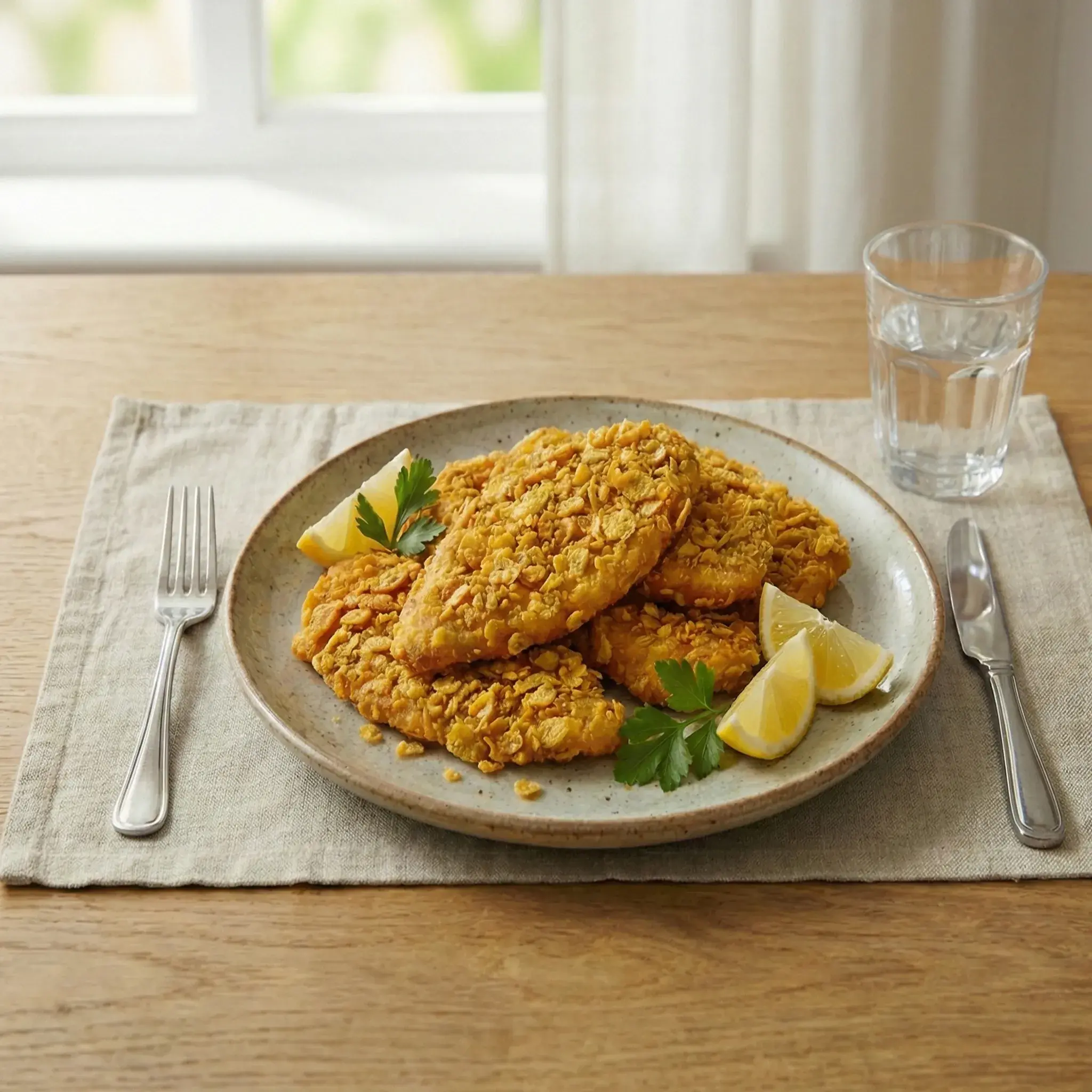 Nahrhaftes Frühstück voller Vitamine, das in wenigen Augenblicken auf dem Tisch steht. Vollkornflakes, angereichert mit 9 Vitaminen und Eisen.