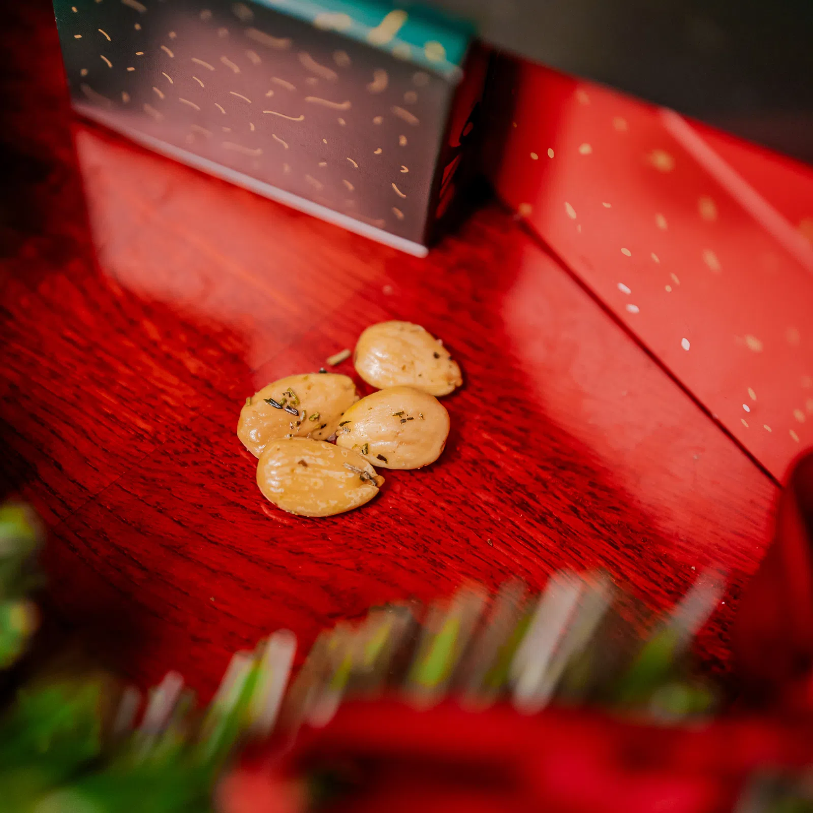 Knusprige Kräutermandeln, verpackt in einer wunderschönen Weihnachtsverpackung, bringen viel Freude, und das nicht nur unter dem Weihnachtsbaum.