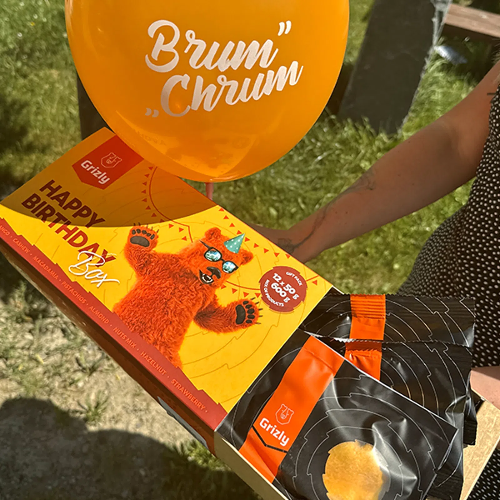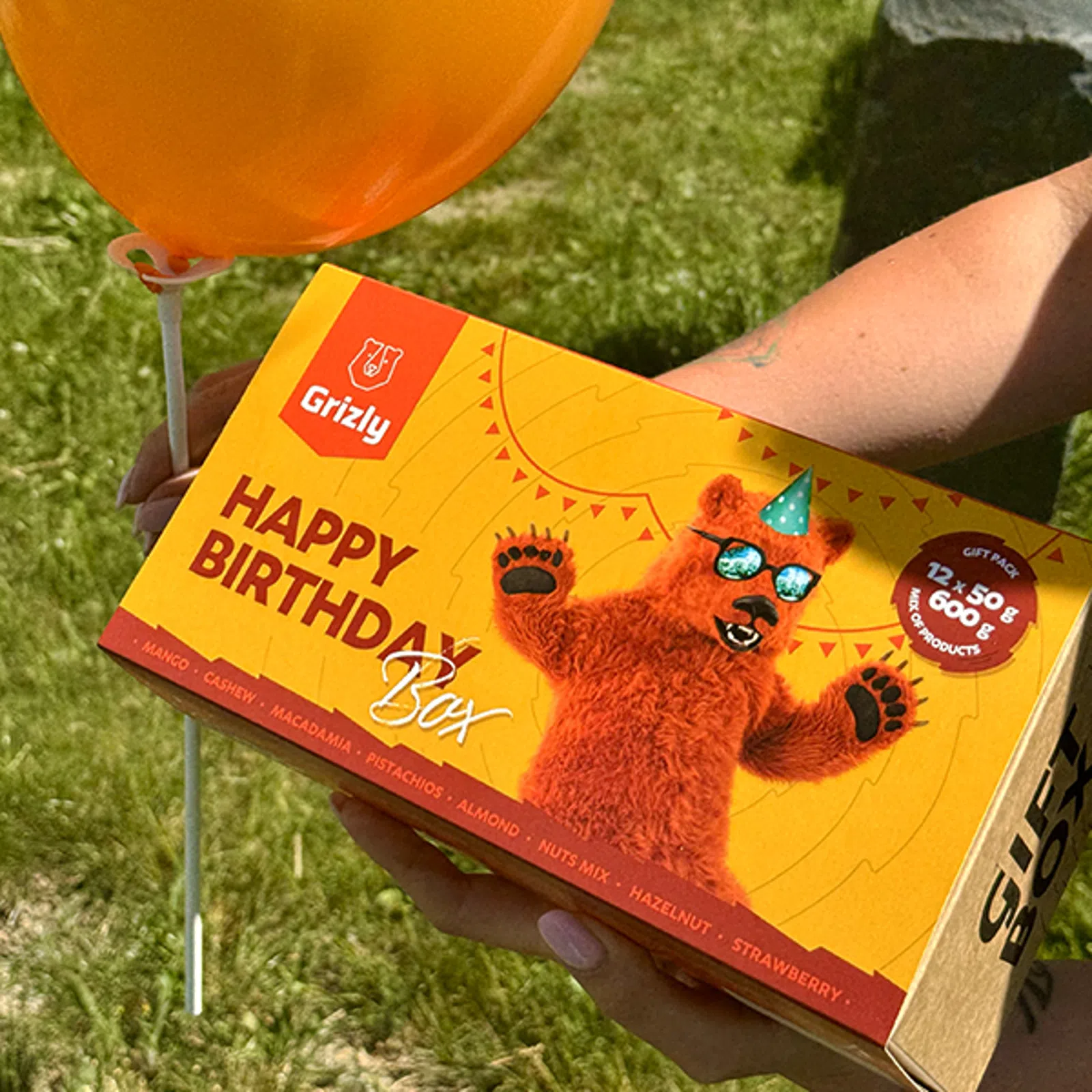 Hat jemand Geburtstag? Woher wissen wir das? Natürlich daran, dass unter den Geschenken die GRIZLY Geburtstagsbox voller Leckereien einen besonderen Platz einnimmt. Die Box ist zwar klein, aber reich gefüllt und zaubert jedem Geburtstagskind ein Lächeln ins Gesicht. Eine Geburtstagsbox zu verschenken, ist immer eine großartige Idee. Der Beschenkte findet darin eine bunte Auswahl an süßen und salzigen Leckereien, sodass er nicht weiß, womit er anfangen soll – ob mit exklusivem Mango, einer Nussmischung mit Trüffelaroma, geräucherten Mandeln oder gefriergetrockneten Himbeeren in Joghurt-Schokolade.
