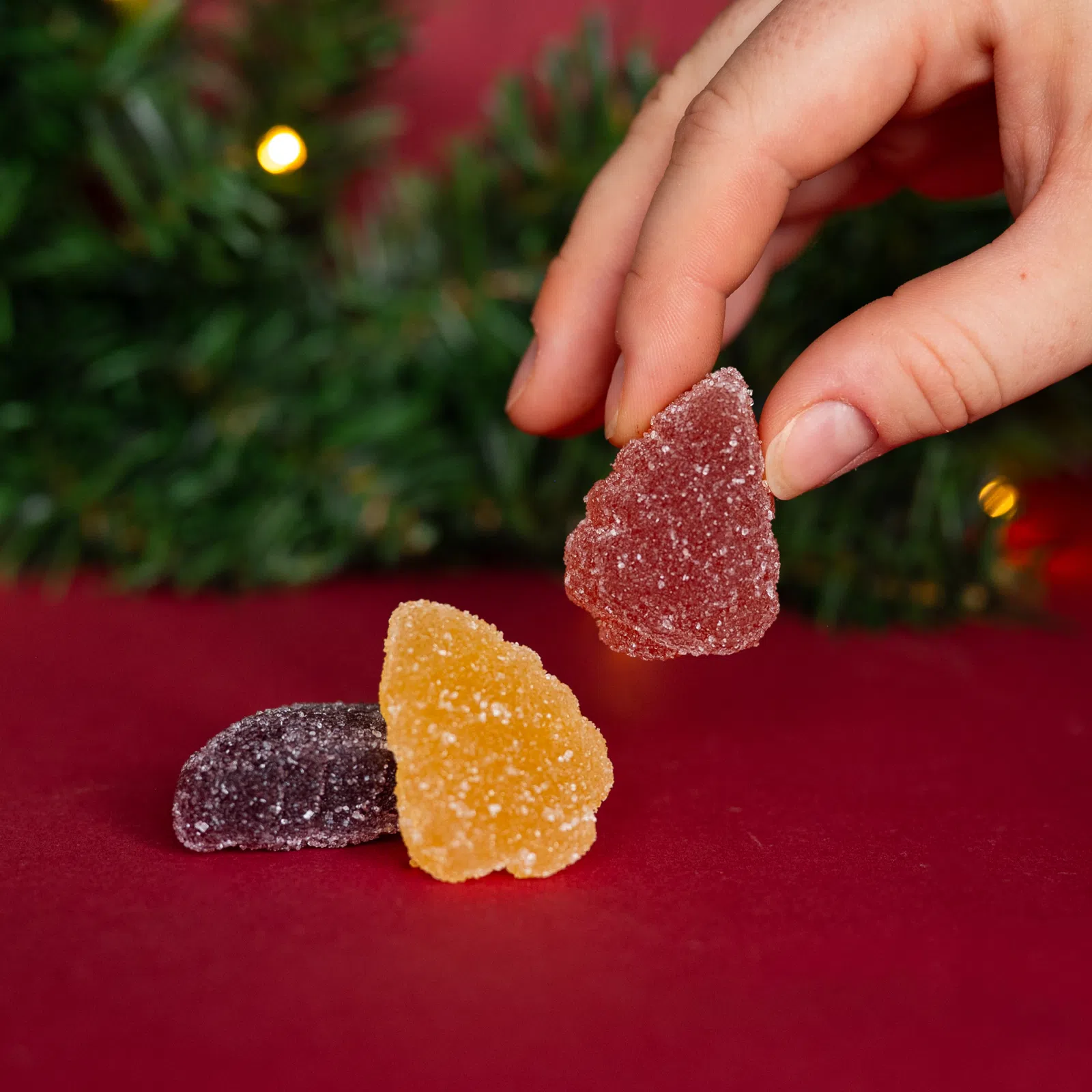 Wie es die Tradition verlangt, muss auf dem Festtisch mindestens ein Teller mit Gebäck bereitgestellt werden. Aber was soll man dieses Jahr darauf legen? Linzer Plätzchen und Lebkuchen sind eine sichere Wahl, aber es könnte noch etwas anderes dabei sein. Etwas Süßes wie Bonbons, aber nicht ganz mit Schokolade… Wir haben es! Zuckerfrucht-Gelee in der Form von niedlichen Tannenbäumen. Es enthält 70 % Fruchtsaft und ist in Zucker gehüllt, sodass es jede Lust auf Süßes zuverlässig vertreibt. Außerdem wird es sich dank seiner Form zwischen all der Weihnachtsdekoration auf jeden Fall nicht verlieren. Und es schmeckt wirklich großartig!