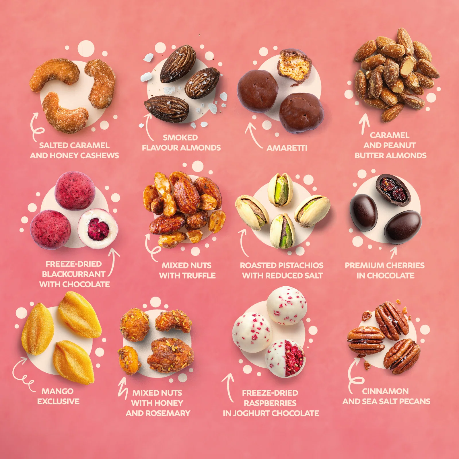 Die Geschenkbox enthält köstliche Kombinationen wie Nüsse in salzigem Karamell, geröstete Pistazien, Mandeln mit rauchigem Aroma und weitere Delikatessen. Naschkatzen werden von Sauerkirschen in Zartbitterschokolade, gefriergetrockneten Johannisbeeren in Schokolade oder den zarten Amaretti-Keksen begeistert sein. Der originelle Mix wird durch Pekannüsse mit Zimt, Mango Exclusive und eine Nussmischung mit Trüffelgeschmack perfekt abgerundet.