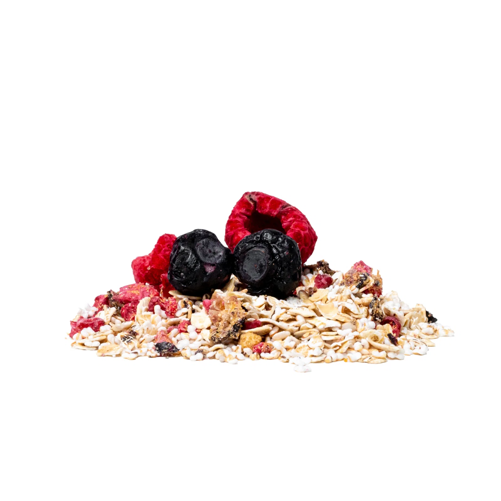 Wie immer – nur gute Zutaten! Gefriergetrocknete Himbeeren und Blaubeeren ergänzen glutenfreie Haferflocken mit Keimen, die im Vergleich zu ungekeimtem Getreide viel leichter verdaulich sind. In der Zusammensetzung des Breis findest du auch Chiasamen, gepufftes Amaranth und getrockneten Rohrzuckersaft.