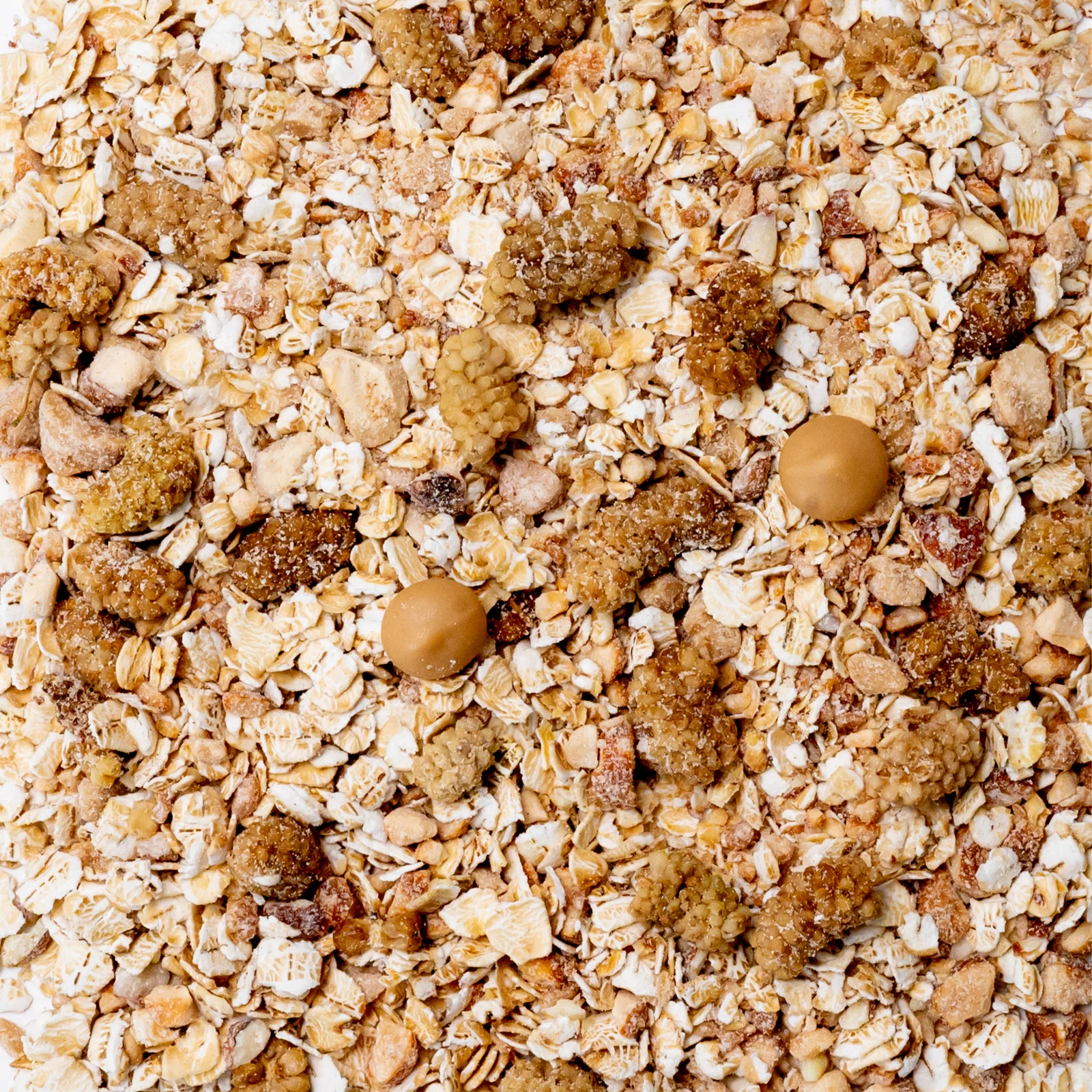 Wie immer – nur beste Zutaten! Köstliche belgische weiße Schokolade mit Karamell und getrocknete weiße Maulbeere werden ergänzt durch glutenfreie Haferflocken mit Keimlingen, die deutlich besser verdaulich sind. Außerdem findest du Stückchen von Cashewkernen in Salzkaramell sowie Mandeln in Salzkaramell.