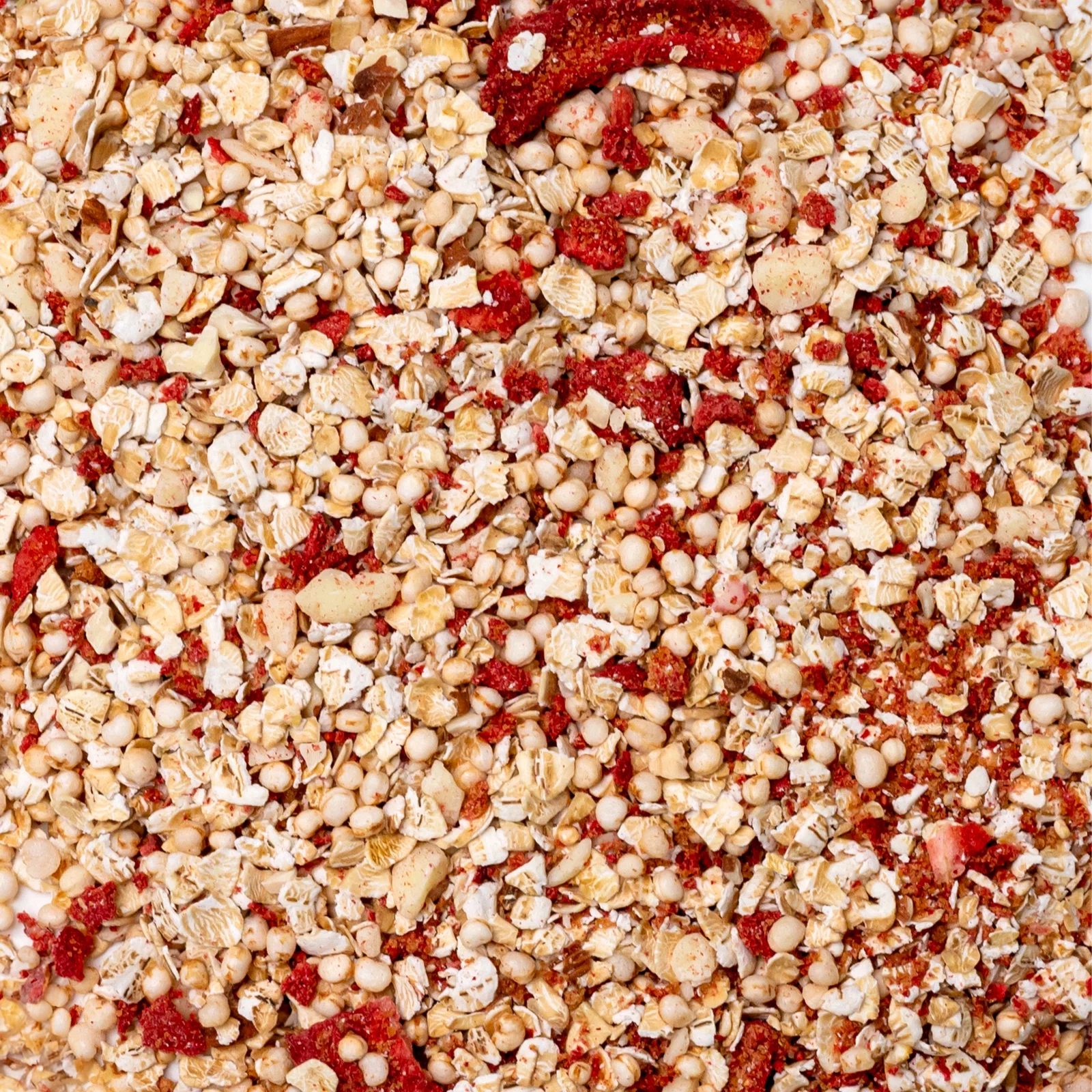 | Zutaten: | Glutenfreies Haferflocken mit Keimen 48 %, getrockneter Rohrzuckersaft, weiße Schokolade 15 % (Zucker, Kakaobutter, getrocknete Milch, Emulgator: Sojalecithin; natürliches Vanillearoma), Stücke von gerösteten Mandeln, Staub und Stücke von gefriergetrockneten Erdbeeren 8 %, gepufftes Quinoa. |