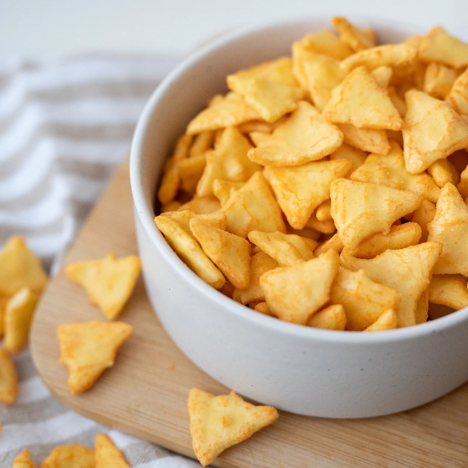 Wenn du alles liebst, was mit Käse zu tun hat, dann sind diese knusprigen Käse-Dreiecke genau das Richtige für dich! Sie sind Mais-Cracker, gewürzt mit einer aromatischen Gewürzmischung, darunter Käsepulver, süßes Paprikapulver und Zwiebelpulver. Ihr größter Vorteil? Sie enthalten weder Gluten noch Palmöl. Wenn du gerne bei einem guten Film, einem Buch oder einem Podcast entspannst und dabei eine knusprige Leckerei brauchst, sind unsere Käse-Dreiecke die perfekte Wahl. Und für echte Snack-Liebhaber – probiere auch unsere Reis-Cracker mit süßem Paprika!