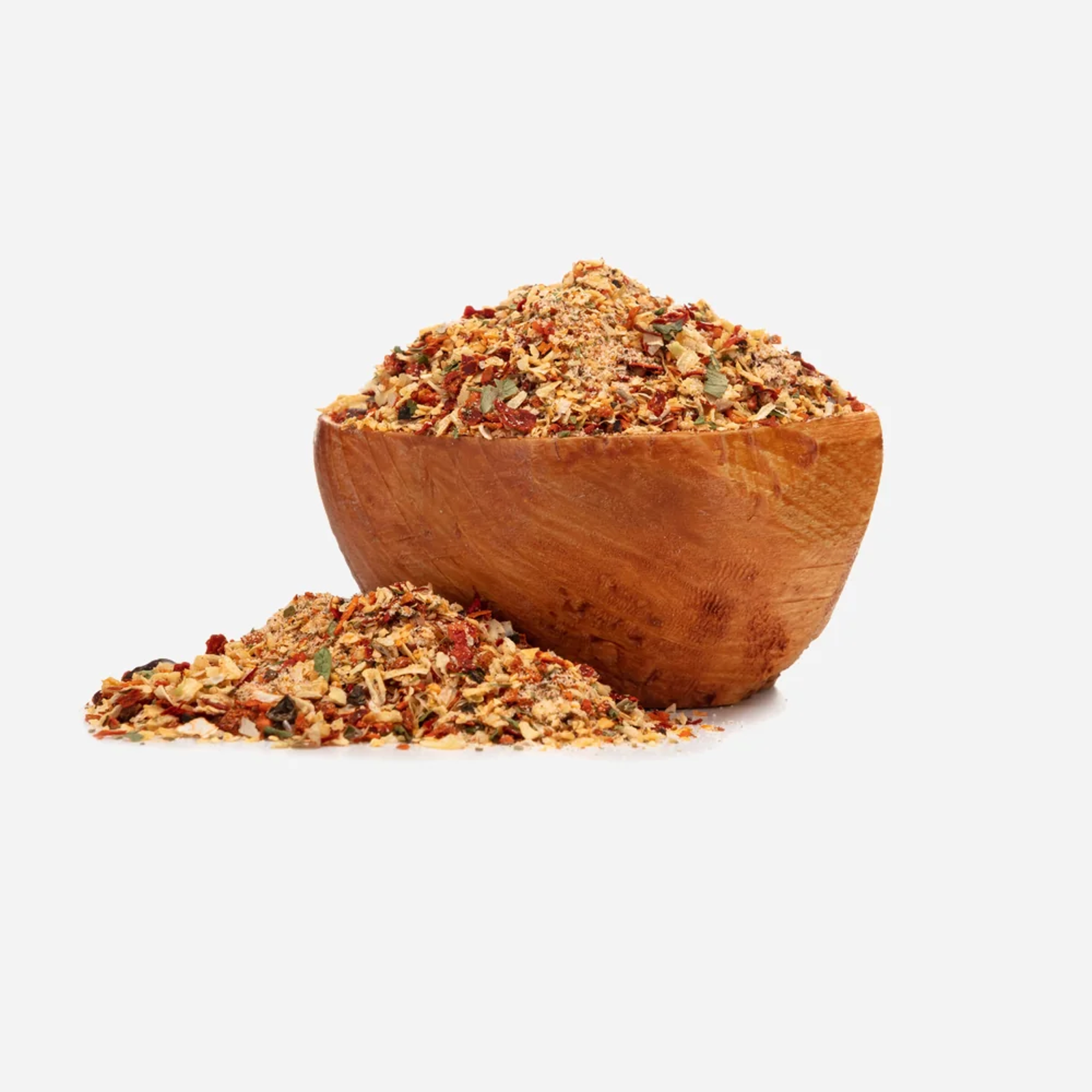 - Zusammensetzung: Gewürz- und Gemüsemischung (Zwiebel, Knoblauch, Paprika, Chili, Pfeffer, Petersilie, Oregano und Salz)