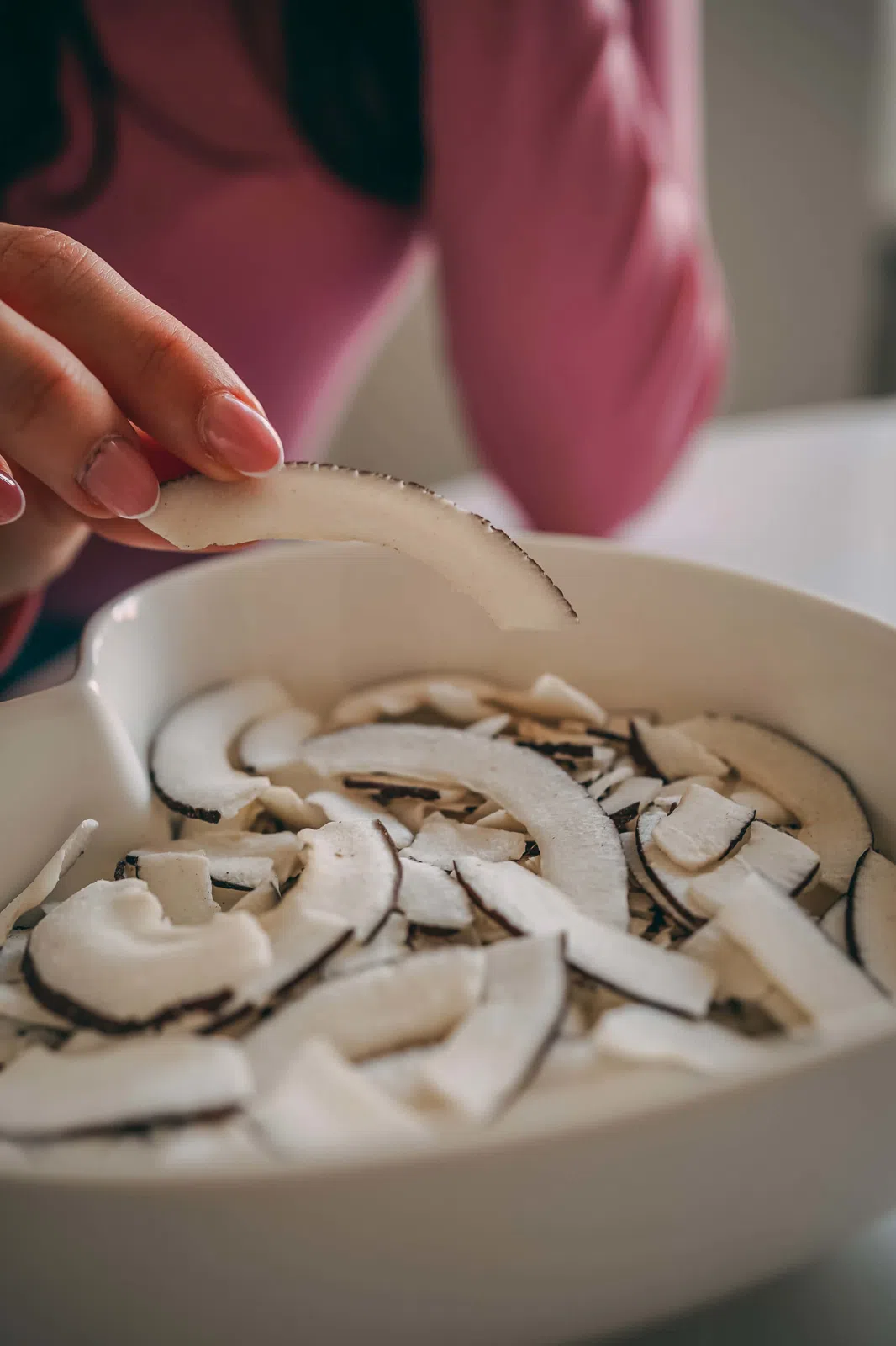 Wenn Sie Kokos in jeglicher Form mögen, probieren Sie auch diese dünnen Chips mit Schale. Sie werden Sie mit einem intensiven Duft und einem kräftigen Kokosgeschmack überraschen. Durch den höheren Fettanteil sind sie wirklich saftig und können problemlos sowohl Kindern als auch Erwachsenen als leckeren Snack angeboten werden. Wir empfehlen auch, die Chips kreativ bei der Zubereitung von Speisen zu verwenden. Versuchen Sie, damit Desserts zu dekorieren, sowohl gebacken als auch ungebacken. Fügen Sie sie zu hausgemachtem Granola hinzu, streuen Sie sie auf den Frühstücksbrei oder erstellen Sie Ihre eigene Mischung mit Nüssen und getrockneten Früchten. Einfach alles, was Ihnen einfällt.