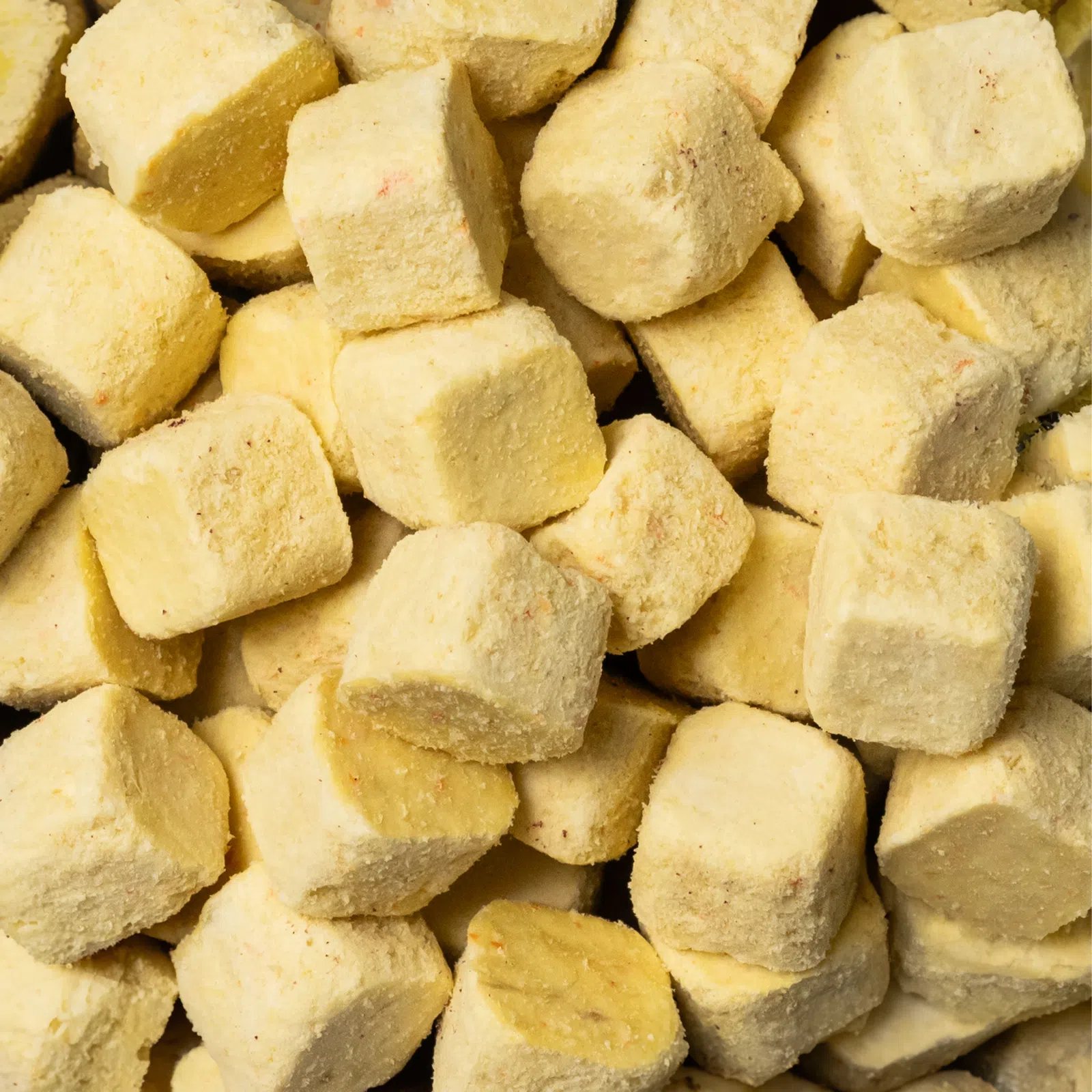 Nur drei Zutaten – und so viel Gutes! Für diese geschmackvollen und nährstoffreichen Würfel werden nur gefriergetrocknete Kokosmilch, Mango und Karotte verwendet. Keine weiteren Zusatzstoffe nötig. Vielleicht erinnerst du dich: Normalerweise werden Konservierungsstoffe zur Kokosmilch hinzugefügt, damit sie länger haltbar ist – aber nicht in diesem Fall! Durch die Gefriertrocknung entzieht man der Milch schnell das Wasser, sodass keine weiteren Zutaten nötig sind.