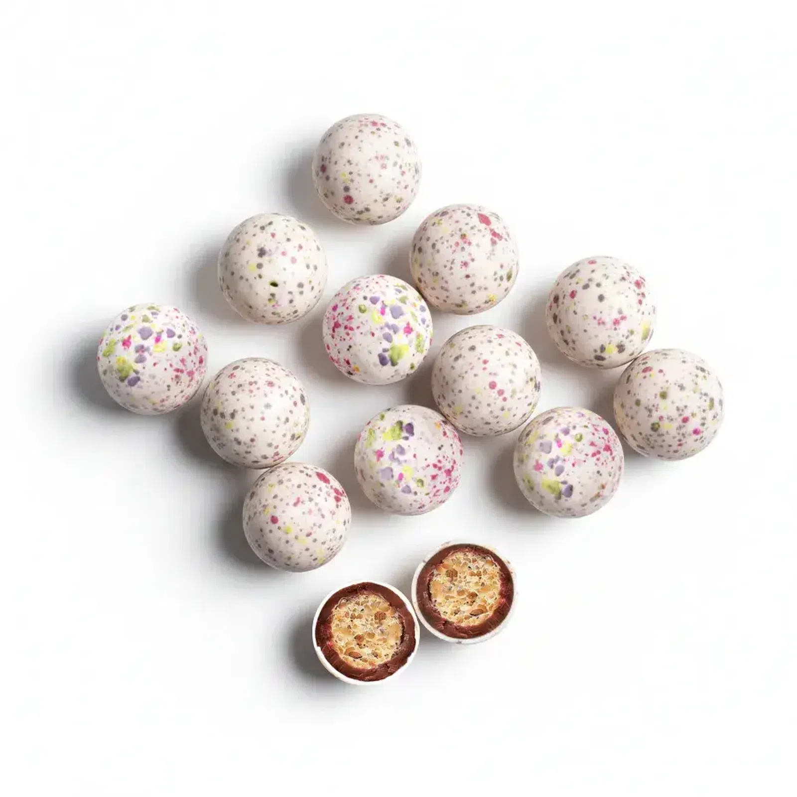 Kleine Kugeln voller Frühling und Freude. Das knusprige Oster-Dražee verbirgt einen leichten Crunch, umhüllt von einer großzügigen Schicht Milchschokolade und geschützt durch eine feste Zuckerschale. Jede Kugel leuchtet in den Farben des Frühlings und bietet eine perfekt ausbalancierte Kombination aus Knusprigkeit und zarter Schokoladennote. Die ideale Osterüberraschung für Kinder, eine süße Dekoration für den festlichen Tisch und fröhlicher Naschspaß für zu Hause. Denn Ostern schmeckt am besten, wenn es bunt und knusprig ist.