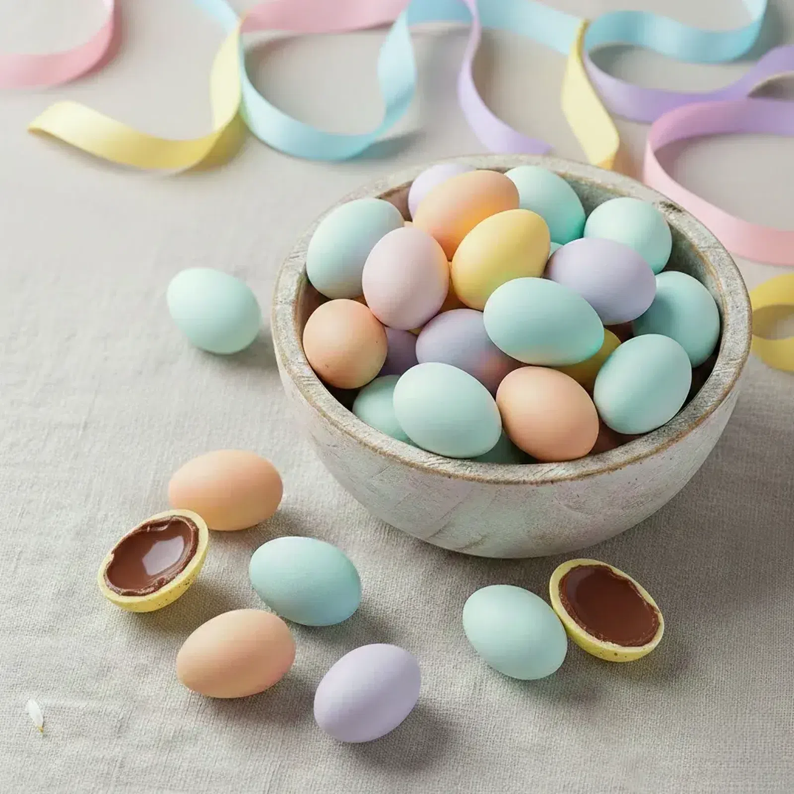 Ein Osterklassiker, der niemals enttäuscht. Bunte Schokoladeneier mit einer knusprigen Zuckerschicht verbergen eine zarte, köstliche Schokoladenfüllung, die auf der Zunge wunderbar zergeht. Perfekt für die Osterüberraschung für Kinder, den festlichen Tisch oder einfach zum süßen Naschen im Frühling zu Hause.