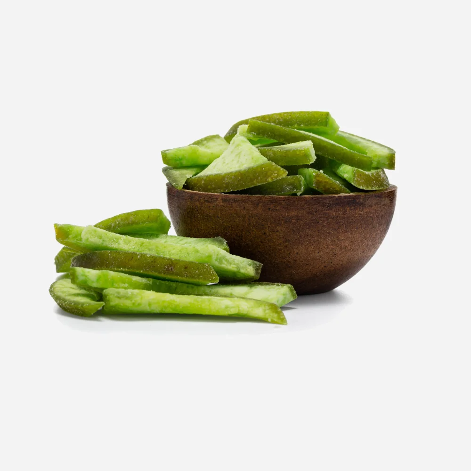 Wenn Sie exotische Früchte mögen, zögern Sie nicht und probieren Sie unsere dünnen Scheiben getrockneter Pomelo. Sie werden von ihrem angenehmen, leicht zitrusartigen Duft überrascht sein. Beachten Sie, dass es sich größtenteils um deren Schale handelt.