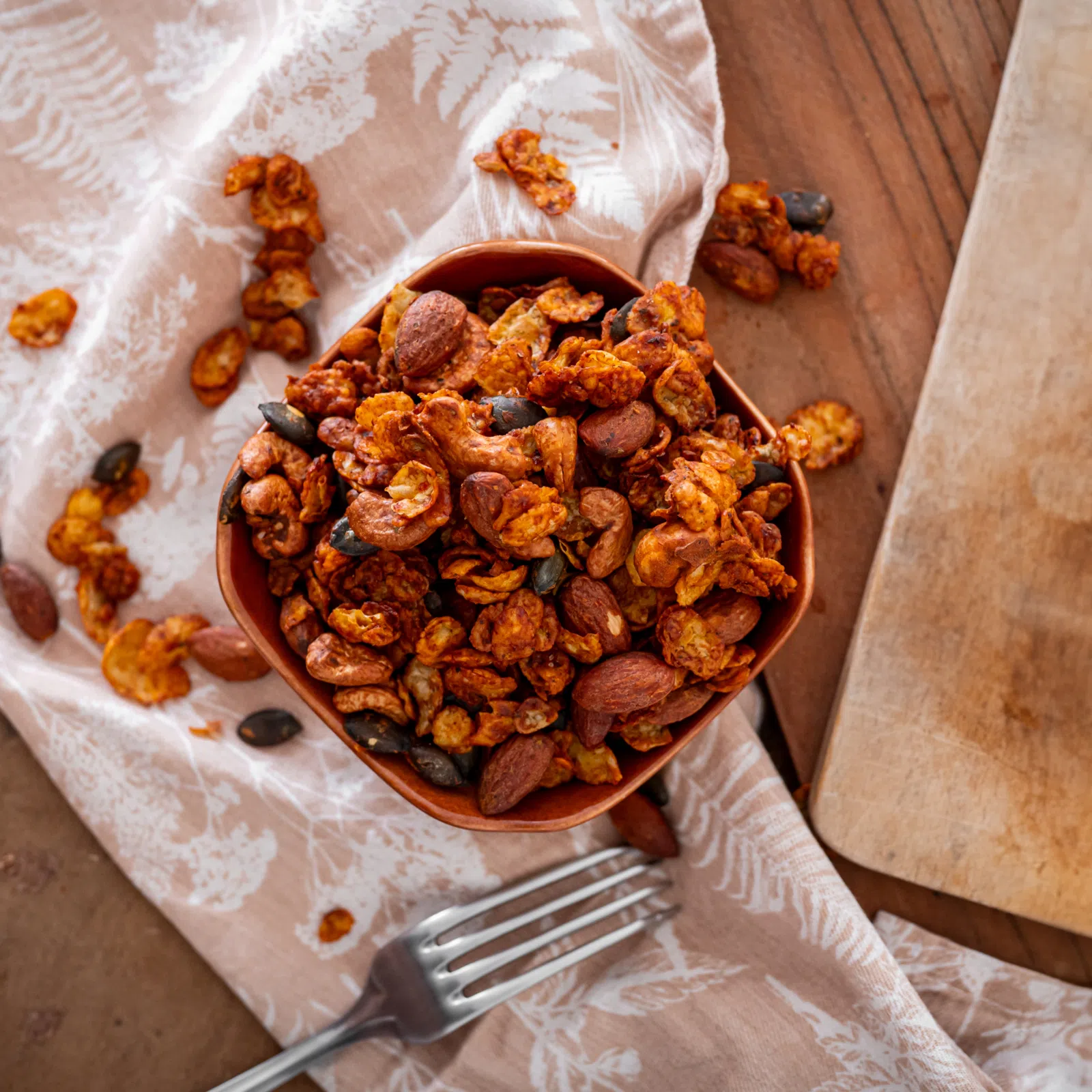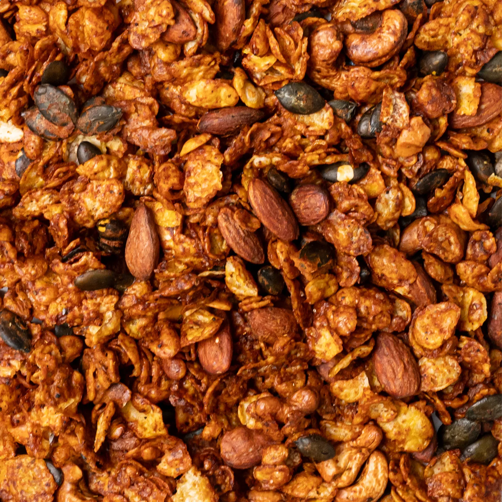 Wir haben ihn aus Maisflocken, Mandeln und Cashewkernen gemischt und vor dem Backen mit duftendem Räuchersalz bestreut. Ein echter Genuss – ehrlich! Bestell dir einen Beutel und du wirst es selbst sehen – oder besser gesagt: riechen. Der Räuchermix ist perfekt als Snack oder als kleiner Happen bei einem gemütlichen Abend mit Freunden. Wenn du gerne in der Küche experimentierst, verfeinere damit Salate oder Suppen.