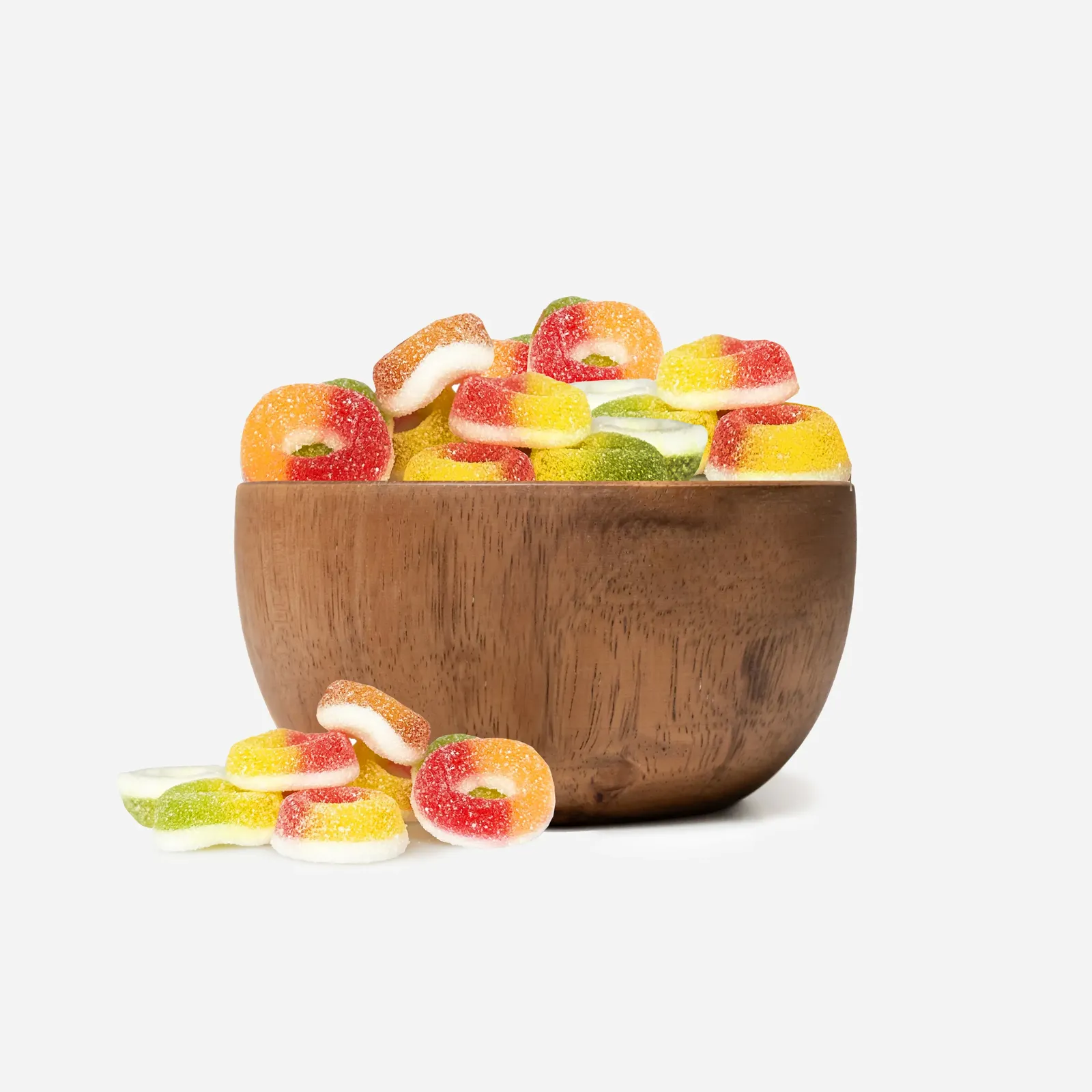 Manchmal hat man Lust auf etwas anderes als Süßes – völlig okay! Statt Süßigkeiten darf es auch mal etwas Saureres sein. Wie wär’s? Diese Fruchtgummis stillen die Lust perfekt. Die Ringe kombinieren Fruchtgummi und Schaum und sind zusätzlich mit saurem Zucker bestreut – für eine ideale Balance der Geschmäcker. Freu dich auf sechs fruchtige Sorten: Ananas, Apfel, Kirsche, Orange, Himbeere und Zitrone.