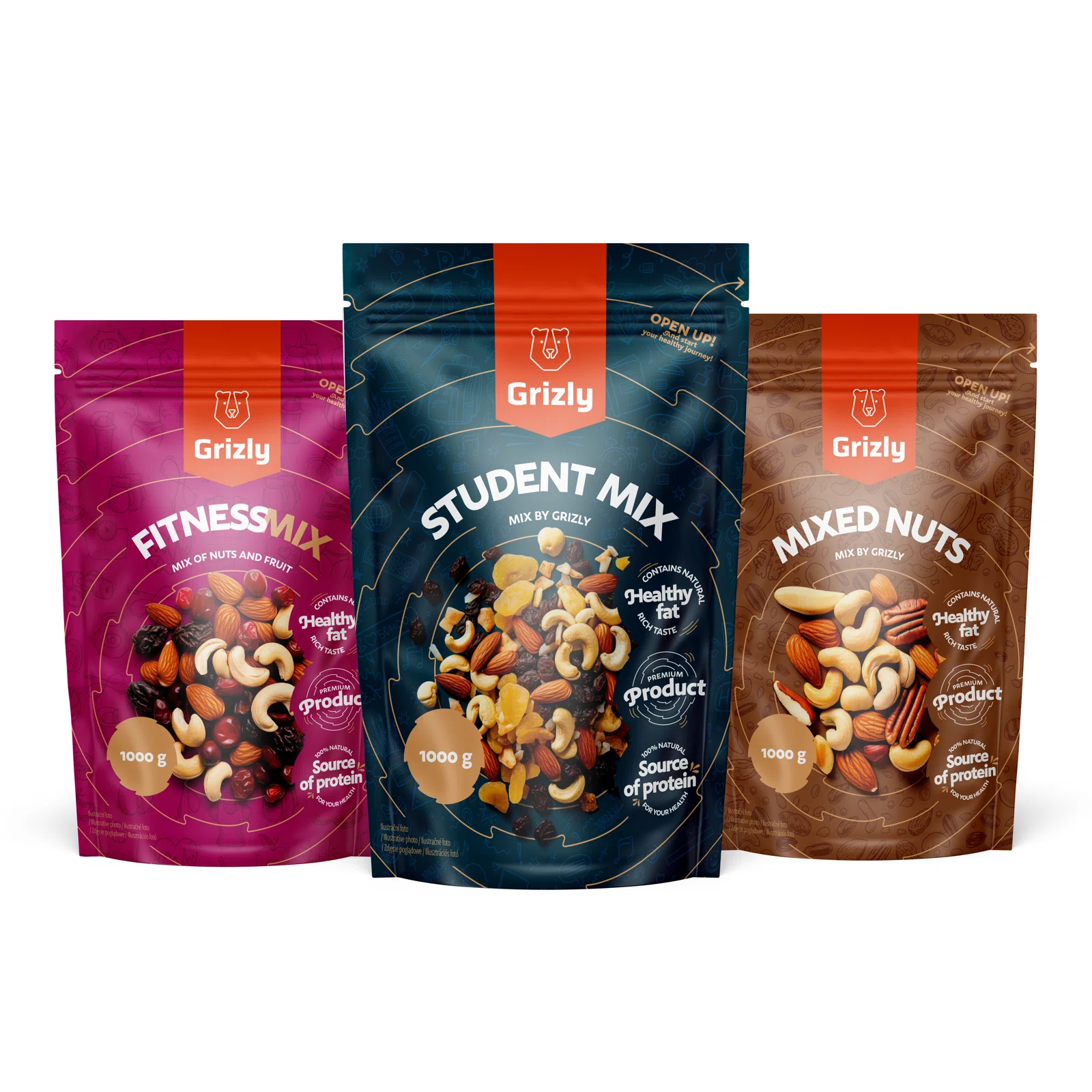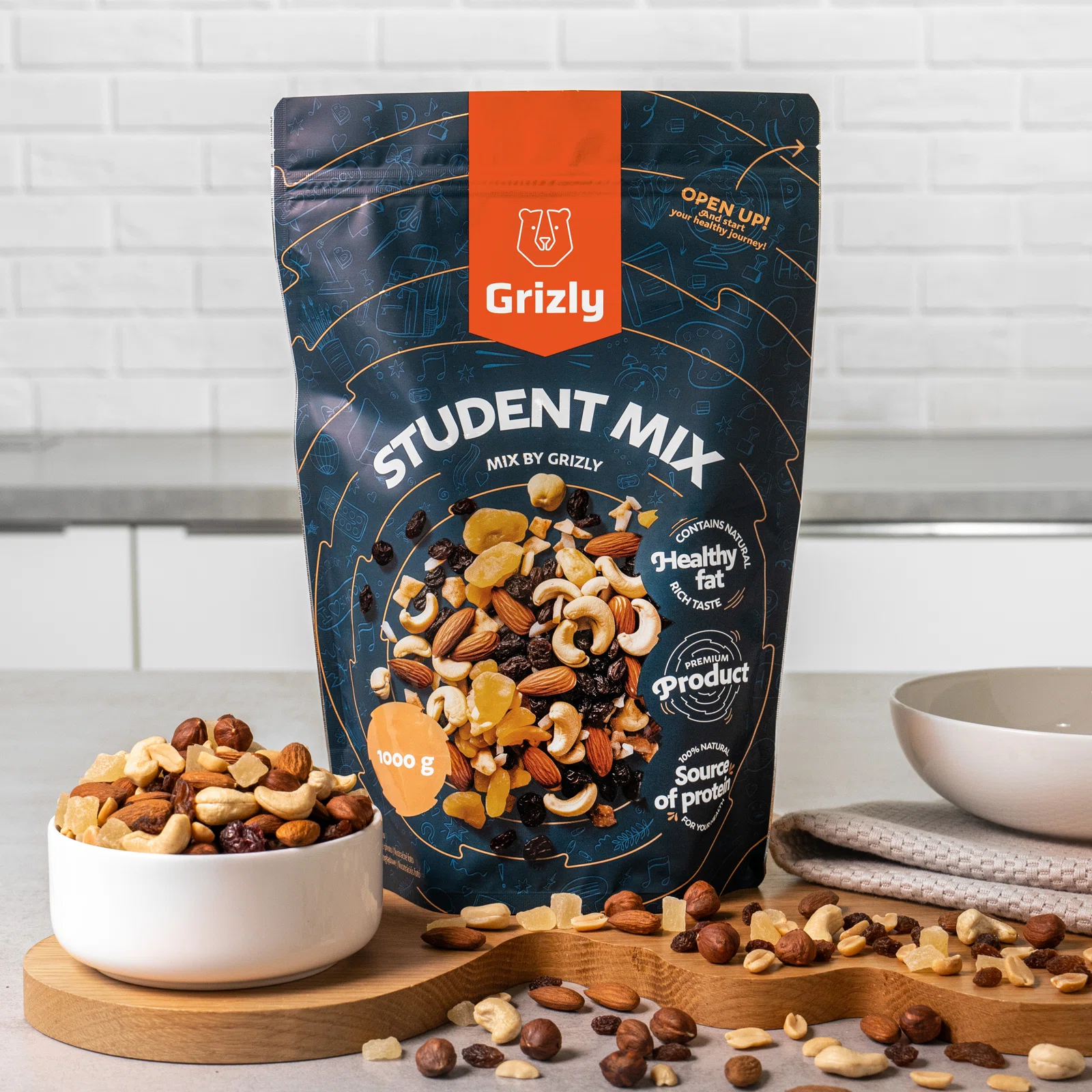 Die bewährte Kombination aus Mandeln, Erdnüssen, Rosinen, Cashewnüssen, Ananas und Haselnüssen macht die Studentenmischung Grizly zu einem großartigen schnellen Snack.