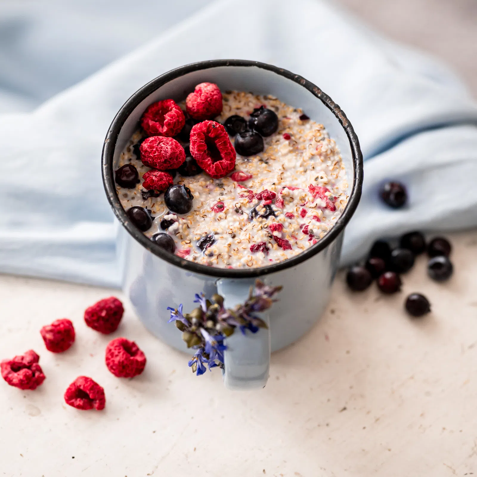Wenn du morgens immer wenig Zeit hast, ist dieser schnelle Frühstücks- oder Snack-Tipp genau das Richtige für dich. Es handelt sich um glutenfreien Haferbrei, der in wenigen Minuten zubereitet ist. Doch die schnelle Zubereitung ist nicht das einzige Plus dieser Mahlzeit. Was dich wirklich begeistern wird, ist der Geschmack, der vor allem von gefrorenen Himbeeren und Heidelbeeren dominiert wird, ergänzt durch Chiasamen, die übrigens eine hervorragende Quelle für Ballaststoffe sind. Zudem haben wir für den Haferbrei glutenfreie Haferflocken mit Keimen verwendet, die im Vergleich zu normalen Haferflocken leichter verdaulich sind. Der Brei ist milchfrei, sodass auch Menschen mit einer Milchintoleranz ihn genießen können.
