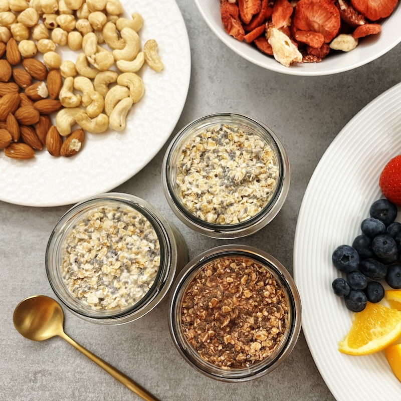 Im Vergleich zum klassischen warmen Porridge haben sie einen fetten Vorteil: Abends vorbereiten, morgens direkt genießen. Kein Stress, kein Abwasch am Morgen, einfach nur loslöffeln.